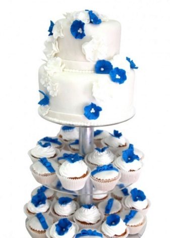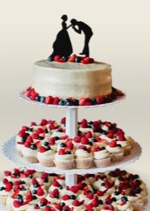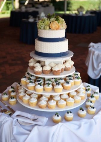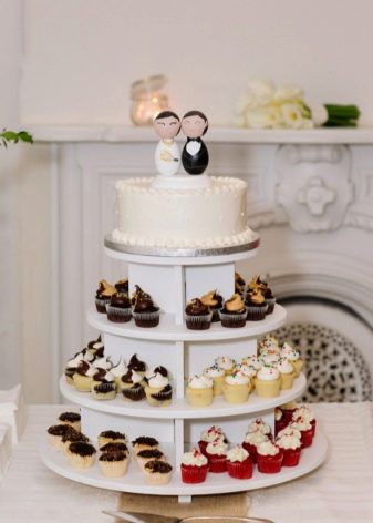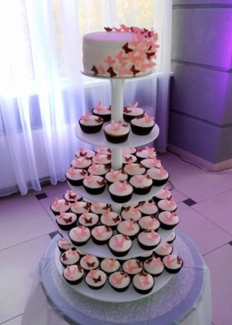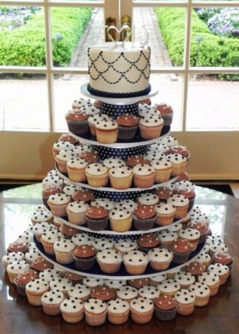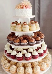 A cupcake wedding dessert, like a traditional cake, can consist of one or more tiers. Moreover, on each of the tiers there may be cupcakes of different or the same kind. So often make chocolate and creamy treats.