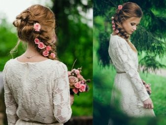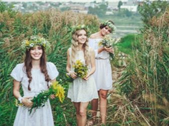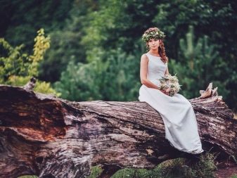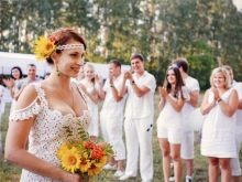 Summer wedding attire should resemble a light sundress in a romantic style. In sewing clothes for the bride, linen, guipure, cotton are used, in the decor there is chiffon, organza. It will be ideal to complement the image with a wreath of wild and garden flowers, herbs, mimosa twigs, wheat and rye spikelets. The legs of the bride can be decorated with stylish ballet shoes or sandals.