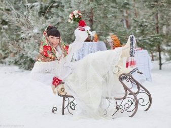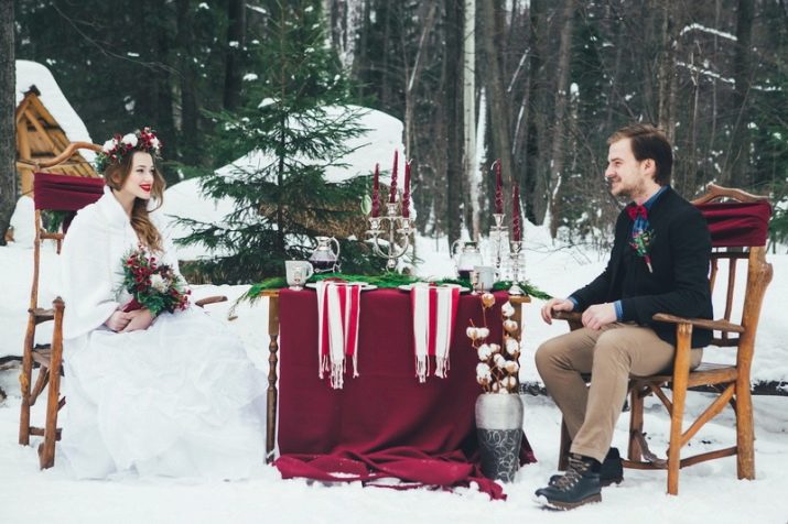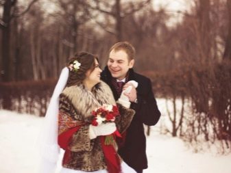In the winter attire of the bride and groom there should not be sequins, rhinestones. It is better to use unobtrusive decor from the notes of embroiderers - delicate lace. Wardrobe should be insulated with a fur clutch. Shoes are relevant in the form of shoes with a heel-wineglass. But if the bride often has to be in the fresh frosty air, it is better to dress warmer.