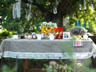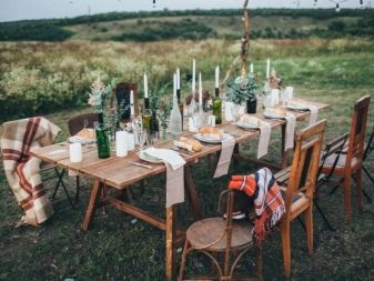 In the open air you can arrange long wooden tables and cover them with linen tablecloths, scatter small sheaves of hay in the corners. The decor of the tables can serve as baskets with fresh flowers, old clay jugs, Khokhloma crafts, candlesticks, embroidered napkins, and much more from the rural theme.
