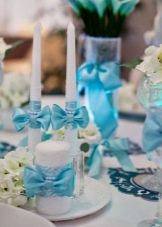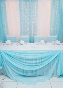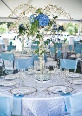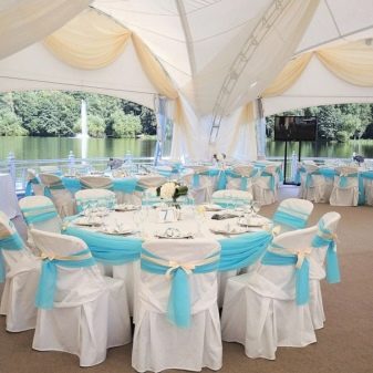The main rule when designing a banquet hall is not to overdo it with a blue color, otherwise the room will be filled with a cold uncomfortable atmosphere. When decorating, you need to know the measure. It is usually recommended to arrange a wedding in blue and white. For example, it is better to make a tablecloth and chair covers white, but stretch a heavenly path along the tablecloth, and tie the same ribbons to the covers. Napkins are best used with lace.