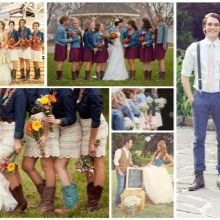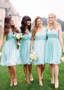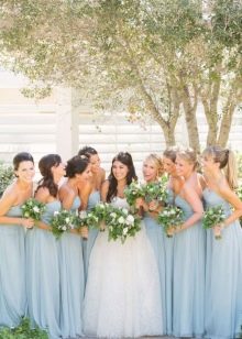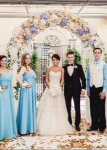 Guests should also wear blue outfits. Bridesmaids in blue dresses and friends of the groom look fun, easy, youth, to the collar of which butterflies of the same color are attached. Particular attention should be paid to their image as witnesses, their costumes should be in harmony with each other. For example, a light knee-length dress in pale blue is suitable for a girl. Then the witness should pick up a shirt in tone, it is possible in a cage.