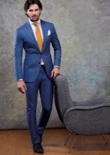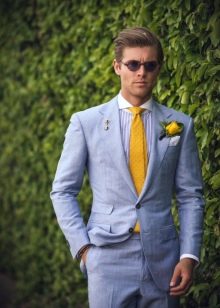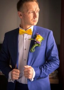 Festive dresses of the newlyweds can be made in blue tones. You can emphasize such an outfit with a golden accessory.For example, the groom will look very expressively in a blue suit and a golden tie. Another option for the groom is to replace his jacket with a blue vest with a golden bow tie. This is a more recent option.