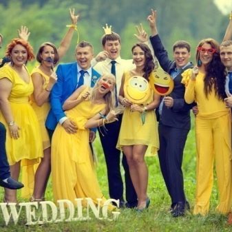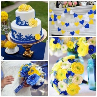 - Yellow or gold. The combination of yellow and bright blue or blue looks especially impressive. A great option for an autumn wedding. The celebration will very well fit into the landscape with falling leaves against the background of cloudless skies.