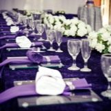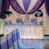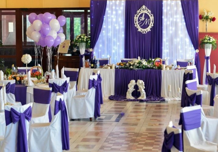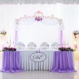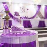 Only some elements of the interior should be highlighted in lilac, in order to avoid clumsy. You can make floral arrangements with color, decor on the table, on the walls. If you are not sure how well the painting will look, it is better to consult a designer. The zone of young people should be allocated separately. It can be a floral arrangement on a table or a composition of balloons behind the backs of the bride and groom. Sometimes the table they are sitting at is highlighted. Of course, such design is carried out at the request of the newlyweds.