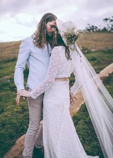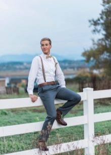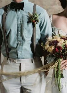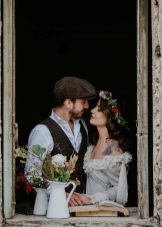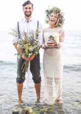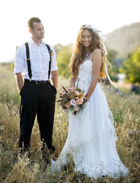 A strict suit, elaborate shoes and a festive tie - a list of what you do not need to wear for such a wedding. The groom should purchase loose trousers in which he will be comfortable. They must be made of natural fabric. The image is complemented by comfortable boots and a casual shirt. To make the man’s outfit more interesting, you can use a not too strict vest and a creative, stylish tie. Another add-on option is suspenders. If you need to wear a jacket, the thing should be as comfortable as possible. It should not be a costume pair with trousers.