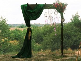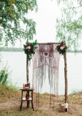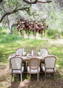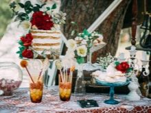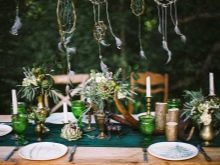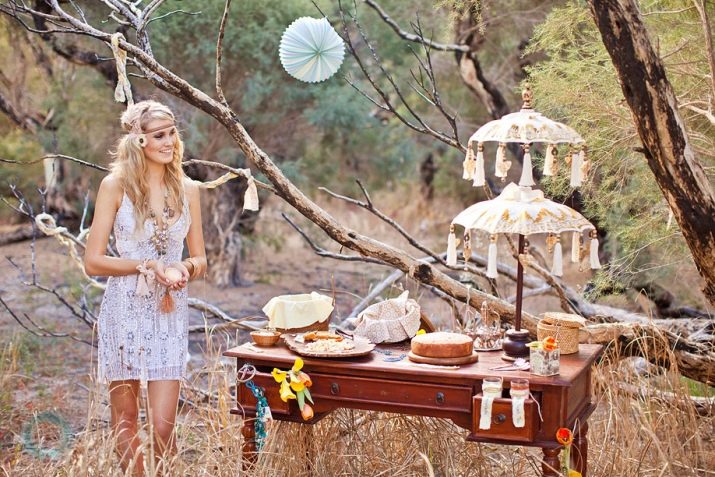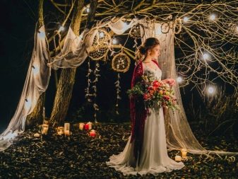 This time of the year is the most successful option for holding a wedding in a similar style, as the newlyweds and guests can easily dress (which requires a bohemian style), and the ceremony can be held on the street without any problems. Often events take place around lush, voluminous trees or picturesque, aesthetic driftwood. A cozy venue is organized at which the wedding ceremony is held. Another option is an unusual arch, which is an accent. You can decorate the place with the help of carpets and tapestries, using colored ribbons, small bouquets placed in jars that are suspended on a tree branch.