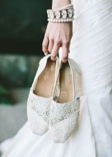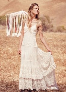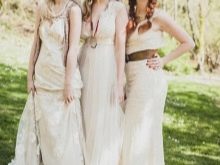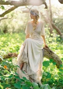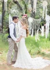 A beautiful wreath made of wildflowers, or ribbons having an ethnic ornament can act as head ornaments. Often brides refuse veils, which can ruin the impression created by the style. You should choose the most comfortable shoes without heels. Some appear before the groom barefoot (if possible). This emphasizes the style and creates an incredibly delicate and pleasant image.