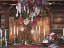 Tents and plague, wedding arches decorated with spruce branches and cones are great as decorations. Successful decorative elements are cozy logs crackling in the fireplace. In this case, the created atmosphere will be just magical.