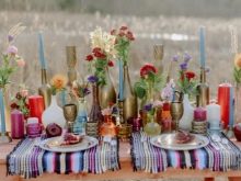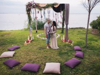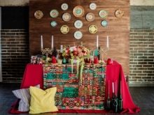 As for accessories, they should be colorful and noticeable. Usually there are a lot of them, they are performed in ethnic style or have a slight touch of "gypsy". A bride’s bouquet is best created from fresh wildflowers. If there is a need to make bright accents, you should use large exotic plants such as lilies, orchids or sunflowers. Roses are what there is no place for such a wedding.