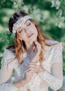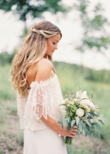 There is a wide variety of wedding hairstyles in a similar style. All options are unusual and attractive.Hair should look deliberately careless, but neat. To make such a hairstyle is extremely simple - you just need to dissolve the curls, tear up the braided braid a bit or make light, calm waves. It is worth abandoning high hairstyles, tight rings, artificial curls, as well as fixed styling.