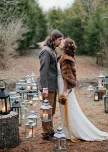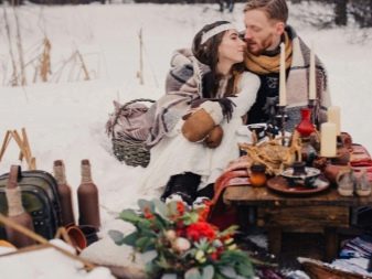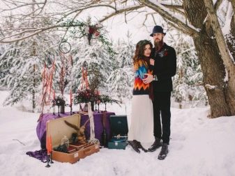 A winter wedding in this style is held in the building - either in the house or in the heated veranda. The premises should be styled antique. You can use the style of peasant life, which is a simple design using creative, fabulous scenery. A few branches of spruce or pine are added to the bride’s bouquet.