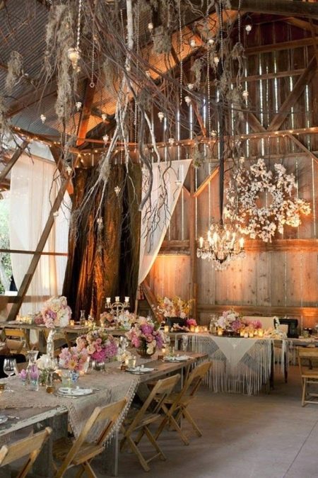 A tent is another suitable option for an autumn celebration in the style of boho. It fits perfectly into the style of the event and is able to save guests from the inconvenience associated with rains. You can cook with a bonfire, this will add a special romance.To create a stronger surroundings, you can rent a hunting lodge. Such places are incredibly romantic and distinctive. If you want to make it even more colorful, the room can be decorated with antique furniture.