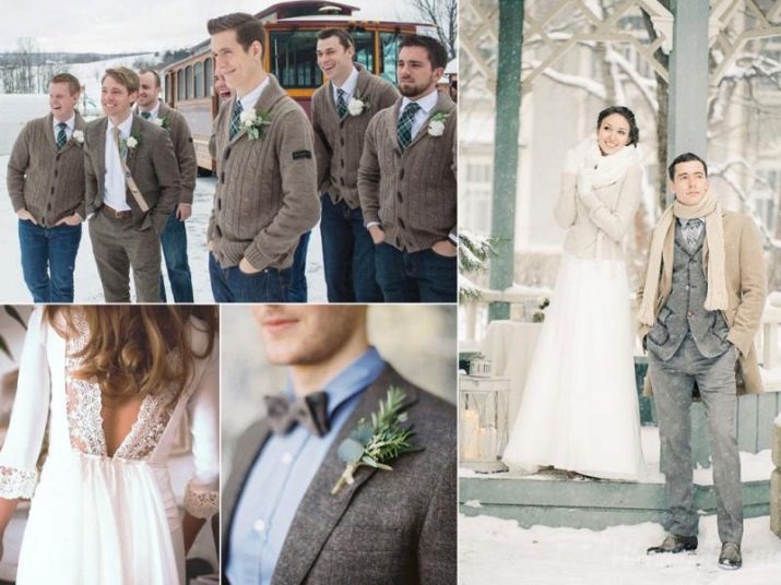 The same accessories from the bride and groom will create a harmonious informal atmosphere and excellent frames of wedding fun. In order for the newlyweds to complement each other, it is appropriate to consider the option with the same mittens, scarves, shoes (uggs, felt boots), caps with earflaps. This “tandem” will especially look bright at a photo shoot or in a wedding love story.