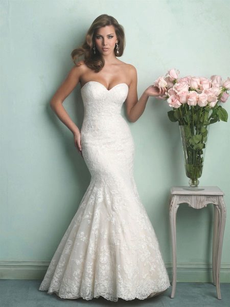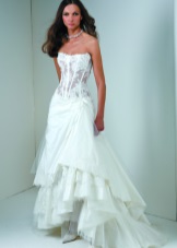 Another attractive model of a wedding dress with a corset can be called a mermaid dress. Such a dress style is characterized by a tight-fitting silhouette and the presence of a fluffy skirt from the knee line. Such a dress will suit girls only with a slender figure, otherwise the wedding dress will look extremely messy on the bride.