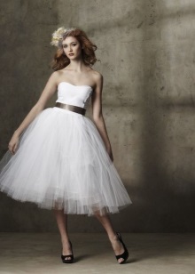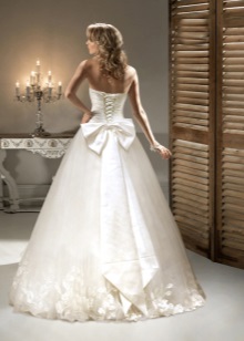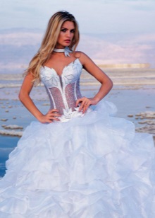 The breasts in such a corset are visually enlarged, and the hips and waist are well tightened. Such models of a wedding dress with a corset to the thigh will add grace and sophistication to the image of the bride. To emphasize the waist line in a dress with an elongated corset, a wide belt can be used. Such a corset looks great both in magnificent wedding dresses, and in more tight-fitting models like "mermaid".