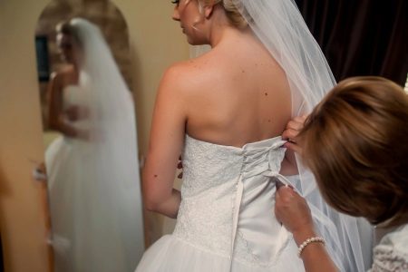 You need to lace up the corset when the girl has already put on the dress for herself. That is why it is not possible to lace up a corset on your own without outside help. During the lacing of the corset, the bride needs to hold the breast with both hands, so that in the process of tying it does not flatten.