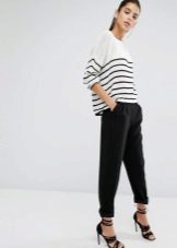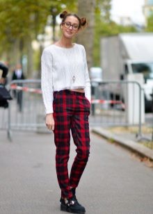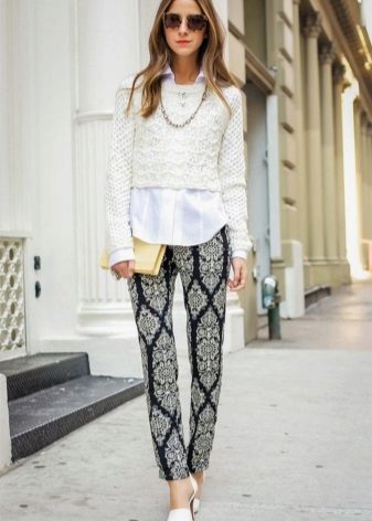 If you don’t have a strict dress code at work, combine it with classic dark jeans. Laconic cut trousers will also fit, shortened pipes will look good. As for the color of the trousers, gray, blue, brown, black, burgundy is appropriate. A concise geometric print is possible - a two-color cell or a thin strip.