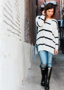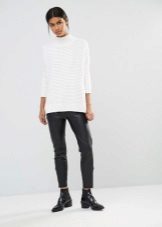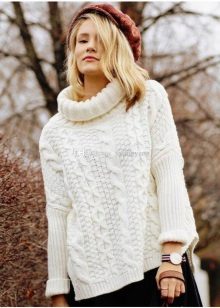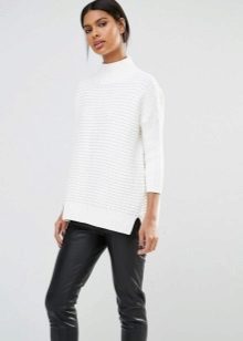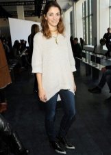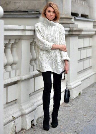 It looks perfect with skinny jeans, skinny pants or leather leggings. Very skinny girls can afford to wear a voluminous sweater with boyfriend jeans.
