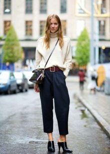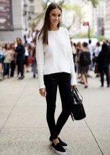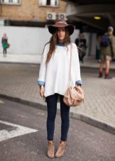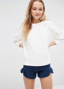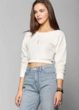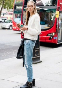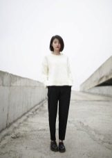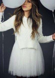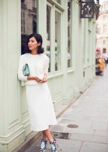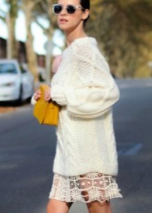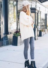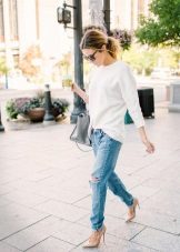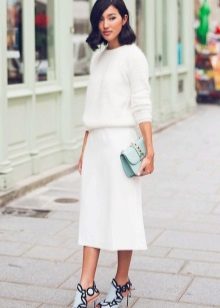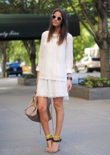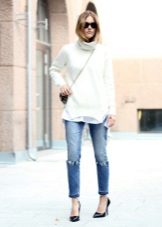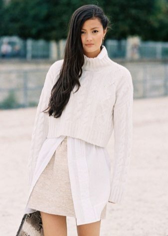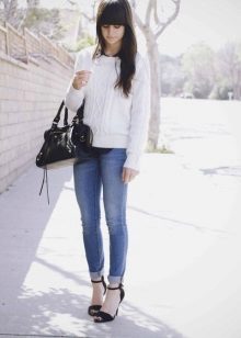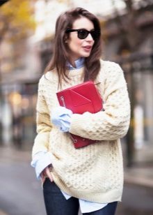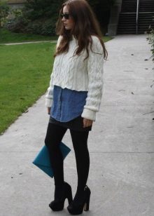 For example, a white sweater will look great with things from blue and blue denim. It can be jeans of any style or a skirt, a denim jacket thrown on top or a shirt, the collar of which will be visible from under the sweater.