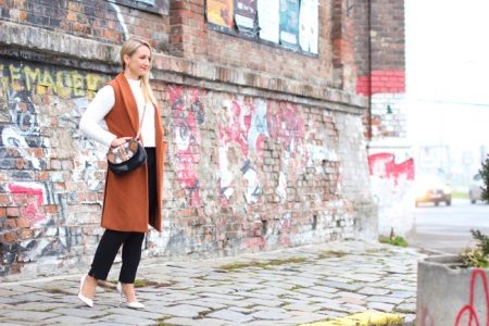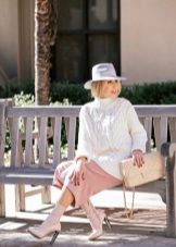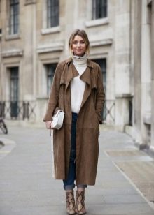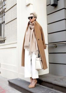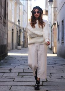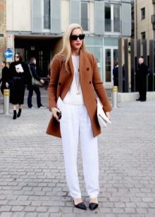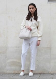 To get a cozy warm look, combine a white sweater with a brown color scheme in the fall. Brown suede or leather will look especially good. A mix of several self-contained textures looks very elegant.
