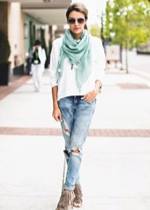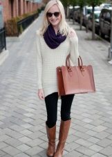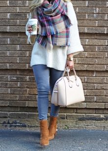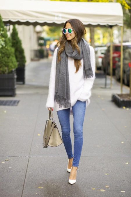 - An image built on contrasts: tight blue jeans and a voluminous white sweater look very cozy and stylish together. The image is complemented by fashion accessories - white boats, a voluminous gray scarf and a bag of the color of coffee with milk.