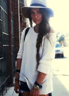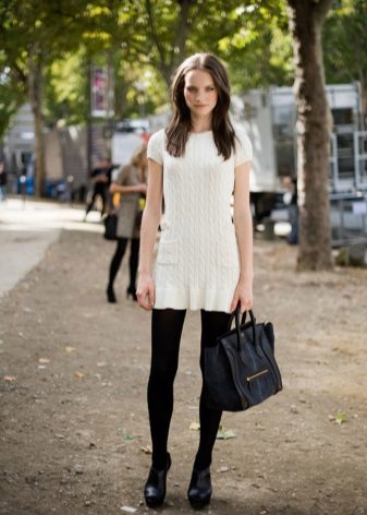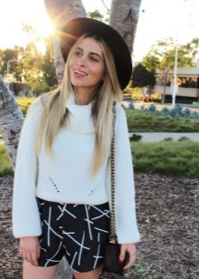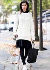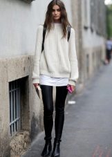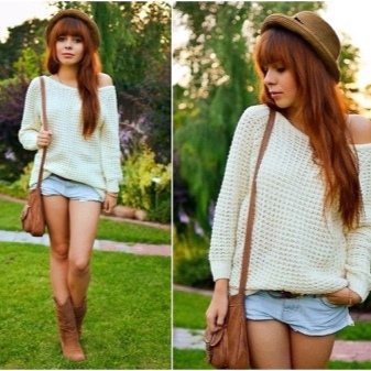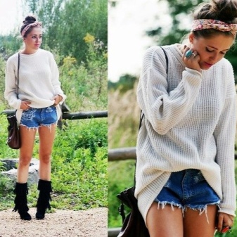 Girls with slim legs can wear a sweater with short shorts and tight tights. Give preference to models of dark color, leather shorts look especially impressive.