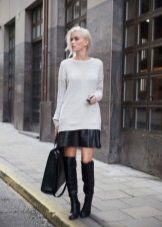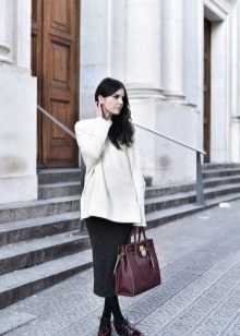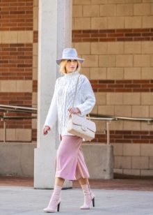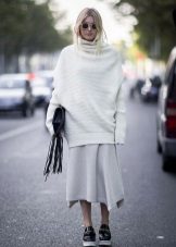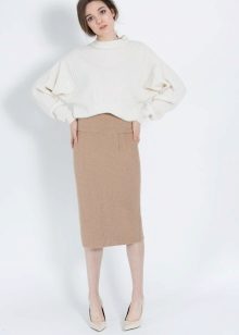Depending on the length of the sweater, you can choose a skirt of any style that suits you. A win-win option is a classic dark-colored pencil skirt. Also suitable are trapeze, flared, godet and other office options.