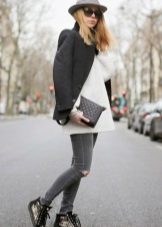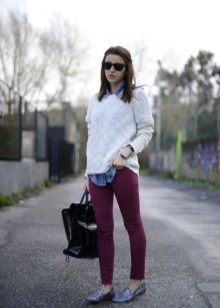 - A white sweater combined with white boyfriends, a powder coat, dark gray boats and a burgundy handbag on a long chain. Great autumn look in pastel colors. It is suitable for a special occasion, date and can easily be upgraded to a business look. Just replace ripped jeans with sleek white trousers.