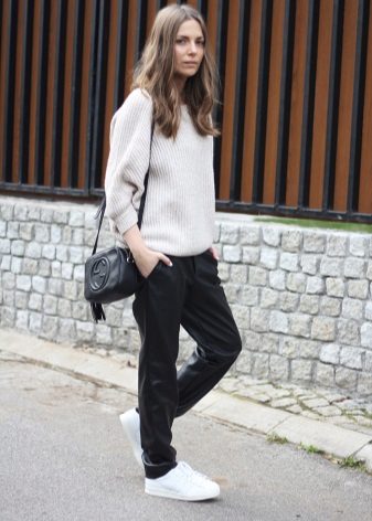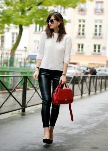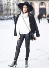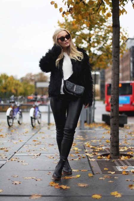 - Another autumnal grunge casual look. Almost total black, which is advantageously diluted with a white sweater. Leather leggings, a shortened fur coat, flat shoes and a small handbag with a long strap. It looks very stylish.