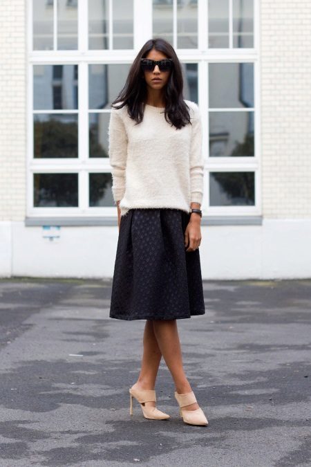 - Laconic image for a romantic date. A fluffy black skirt, white sweater and nude mules. Black sunglasses complement the look. Discreet and sophisticated look.