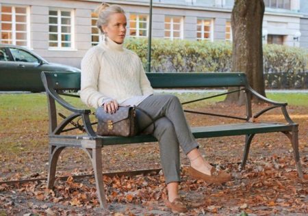 For every day you can pick up gray trousers to a white sweater, especially such a tandem will be appropriate in a business wardrobe. To prevent the outfit from looking too boring, dilute it with accessories of a burgundy, emerald or cobalt color.