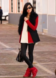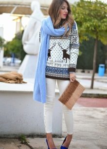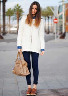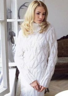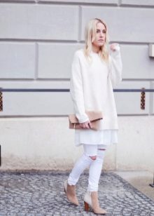 - A long white sweater looks elegant and luxurious. To emphasize its beauty will allow a deep black or red color. And if you want to create a delicate look, complement it with accessories of beige color.