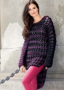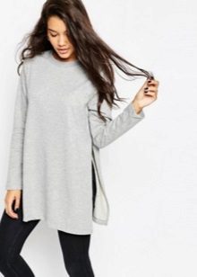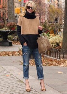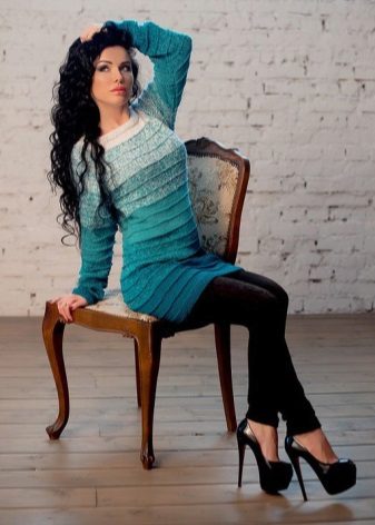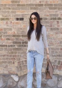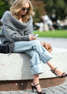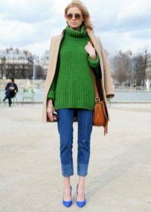For a sweater of any length, you usually want to wear jeans, in the case of an elongated sweater, these are narrowed or even models. Otherwise, the figure may look overweight and disproportionate. If you wear an asymmetric sweater with an elongated back, the front, short edge can tuck inward. This will emphasize the grace of your beautiful girlish figure.