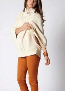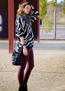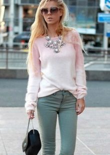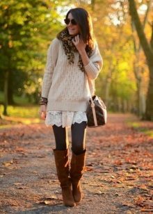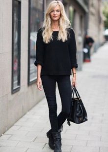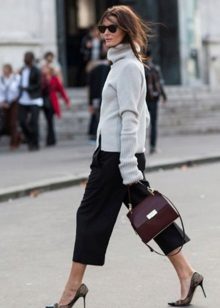 Sets with skinny trousers look no less stylish. In the autumn season, you can give preference to shortened models. The larger and longer the sweater, the more your pants should already be. So that the figure does not look squat, it is better to choose shoes with heels.