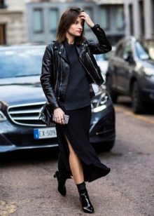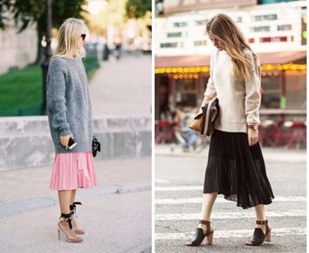 If you like unusual, original combinations, wear a long sweater with a midi-length skirt, which will be visible only slightly. This set is ideal for the beginning of autumn, when a sweater can replace your outerwear.