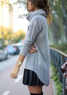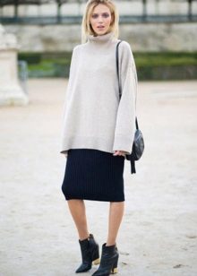 A long sweater is difficult to wear with a skirt, but such a tandem is still possible if you can boast of a slim figure. Narrow, tight-fitting skirts look impressive with free models to the knee or to the middle of the thigh.