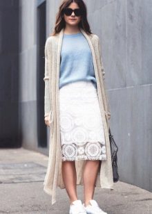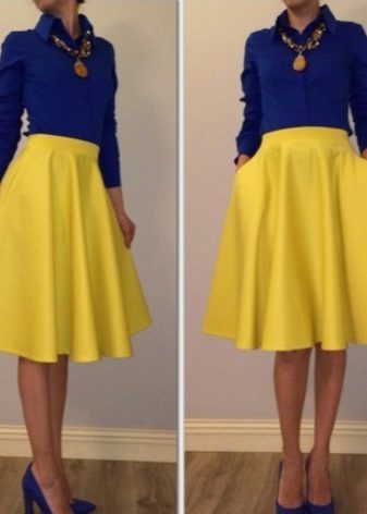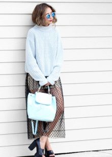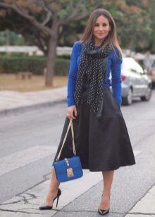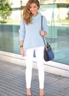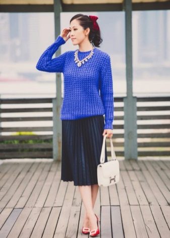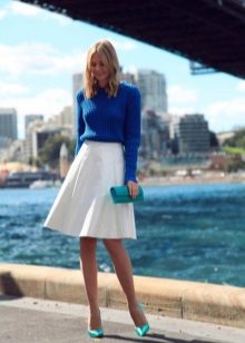 A blue sweater creates an office and business style with trousers and skirts in white, black and dark gray. These are classic combinations that fit into the requirements of the dress code, strict and elegant.
