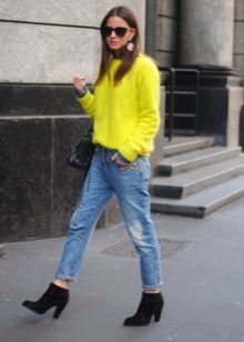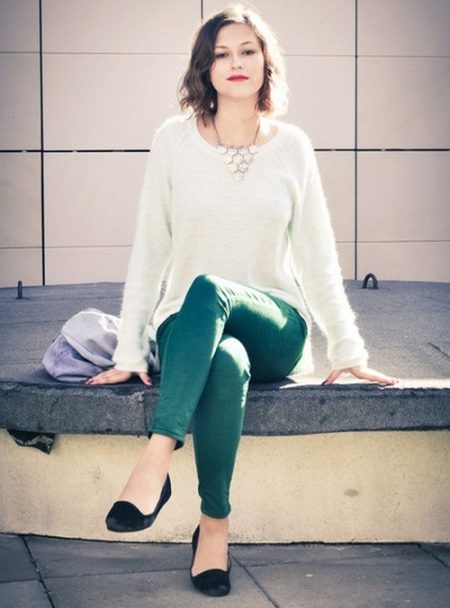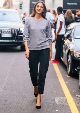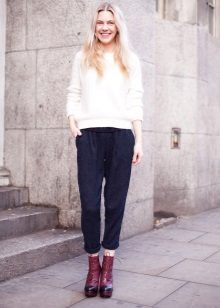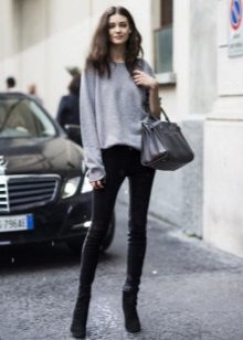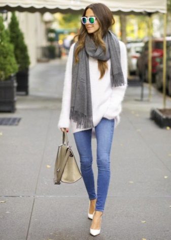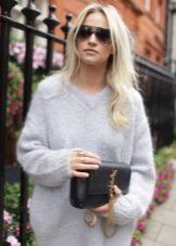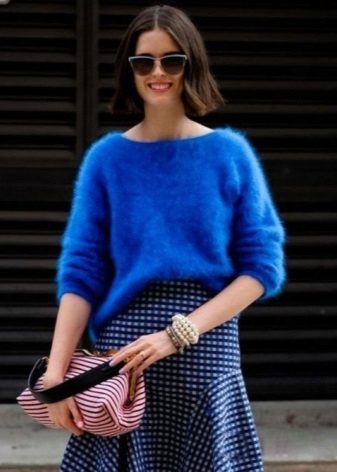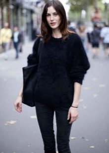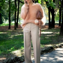 When choosing things in an ensemble with an Angora sweater, it is necessary to take into account the harmony of fabrics. For example, a fluffy top looks inorganic in a tandem with silk trousers or a lace skirt. Angora sweater looks great in combination with denim, cashmere or wool items.