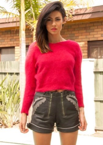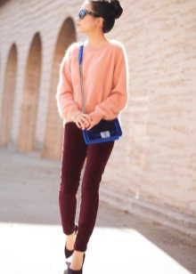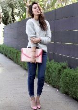 The combination of angora sweater with a skirt looks feminine. You can wear a white pencil skirt with a pink sweater. Perfectly complement the romantic bow with stilettos, a black clutch bag and discreet jewelry. In the cold season, a bright pink coat can be worn on top.