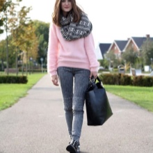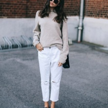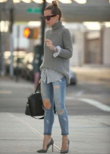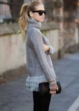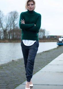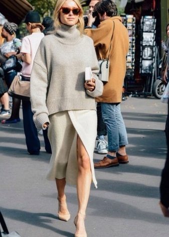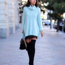 A high-necked model can be worn with a woolen or leather skirt. Loose-cut sweaters and elongated models look great in tandem with a pencil skirt or skinny jeans. An ideal complement to the image will be a soft handbag and jewelry in restrained colors.