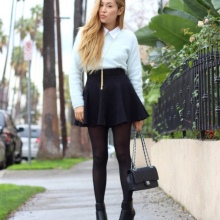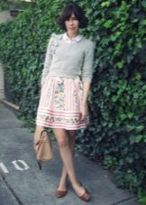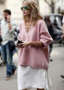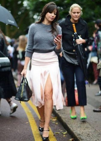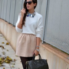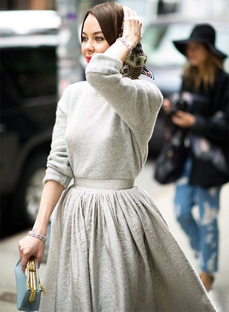 With a snow-white sweater, you can wear a pale pink pleated skirt. Fine masonry will give an image of lightness and airiness. High-heeled shoes will help emphasize the elegant look.