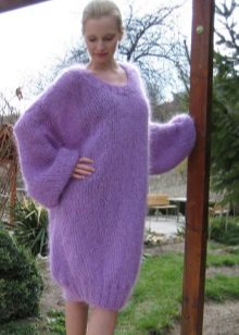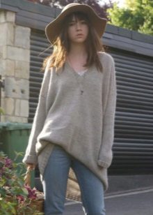 An elongated sweater from angora tight-fitting cut looks elegant and romantic. Fashion designers offer this model in soft pastel colors. Such a sweater is perfect for tall beauties. An elongated model is best combined with tight pants.
