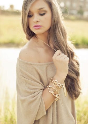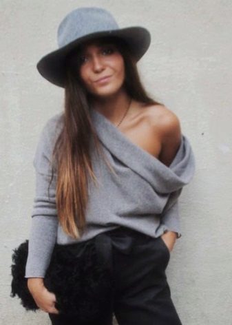 To look sexy and attractive, you should pay attention to an Angora sweater with bare shoulders. With this option, you should wear a bra with transparent harnesses or in tone with a sweater.