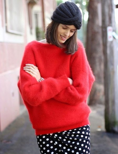 Unusually and romantic, it looks like a tandem of a red sweater and a black pencil skirt in white polka dots. A black knit hat will perfectly complement a stunning bow. The combination of red, black and white never goes out of style.