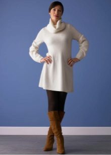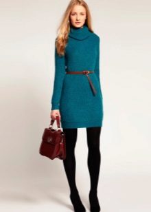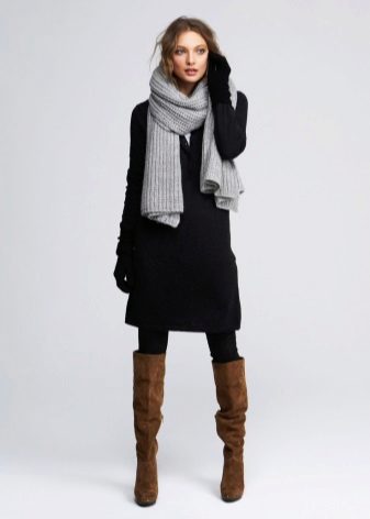 A spectacular look for self-confident women: a tight-fitting short sweater dress + tall narrow boots. A plain dress can be decorated with a wide belt.