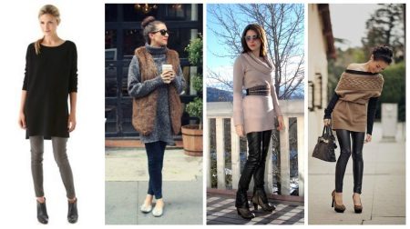 As an evening option, a long sweater with a bright or shiny print or lace decor is quite suitable. Under such a sweater, it is desirable to choose dense tights of neutral tones and classic shoes.