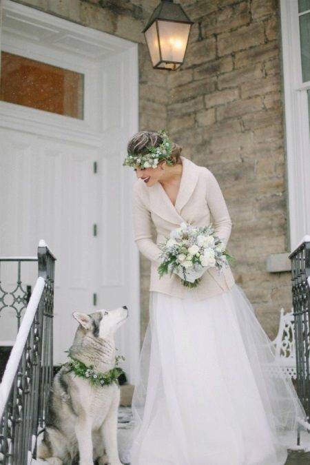 A light blouse or sweater should have the most simple and concise cut so as not to overlap the beauty of the wedding dress, but to emphasize it. The color scheme should be neutral, you can additionally decorate the jacket with a beautiful ribbon.