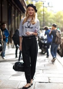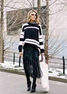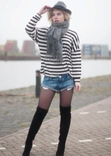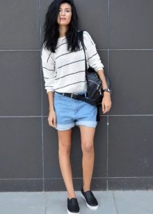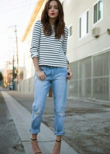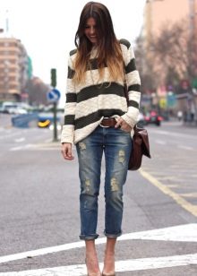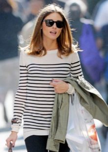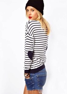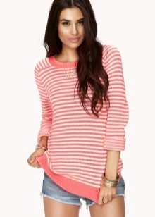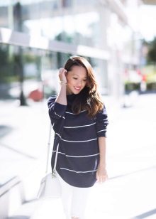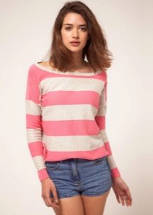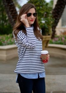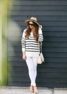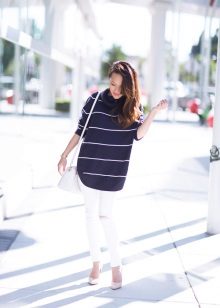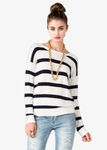 Striped sweaters are truly universal, because they can be made an attribute of both everyday attire and business. It is best to combine them with trousers, jeans, a miniskirt and a pencil skirt or shorts. You can wear a jacket over a sweater and pullover. The best part is that the image can be completed with any type of shoe, starting with boots and ending with high-heeled shoes.