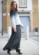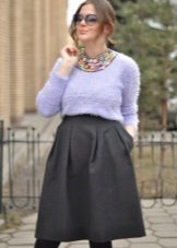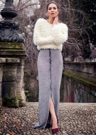 Fluffy sweaters with an asymmetric cut and interesting colors, combined with a long skirt form an elegant evening outfit. Stylish high-heeled shoes complement the stylish bow.